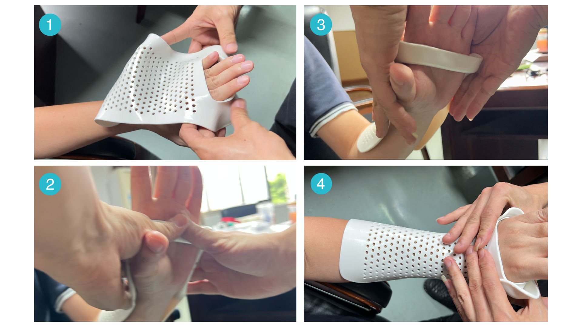 Molding and Hardening:Mold the splint upwards along the palmar side to fit the hand, keep it for 3 – 5 minutes until it cools and hardens, and then remove it.