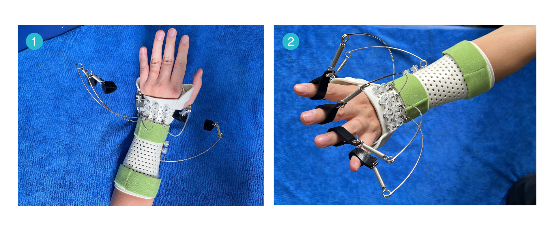 Fix the Components:Arrange the elastic wire properly, install the spring and finger sleeve in sequence, and fix them at the corresponding positions on the splint or the hand with screws, ensuring that the wire is tightened and the spring works properly.